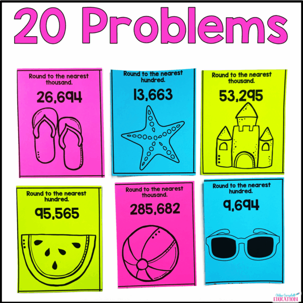 You found the perfect summer math activity for practicing rounding whole numbers! Your students will LOVE to practice rounding whole numbers with this solve the room activity. Students will find the problems around the room, solve the problem, then write the answers on their recording sheets.