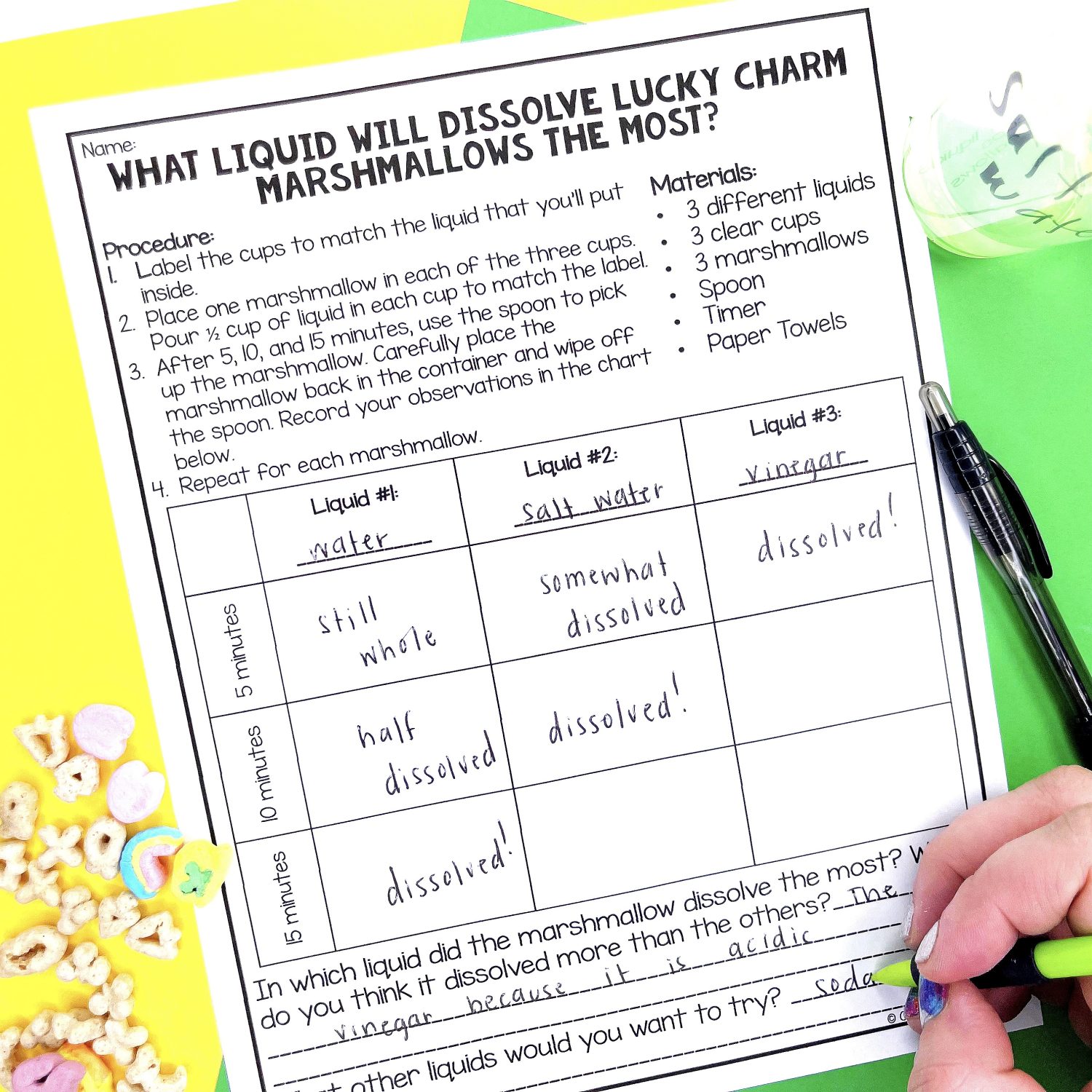 This St. Patrick’s Day experiment encourages students to test 3 different liquids to see which one will dissolve the marshmallow the fastest. This is a great, open-ended experiment because you can give the students free choice over what liquids they test.