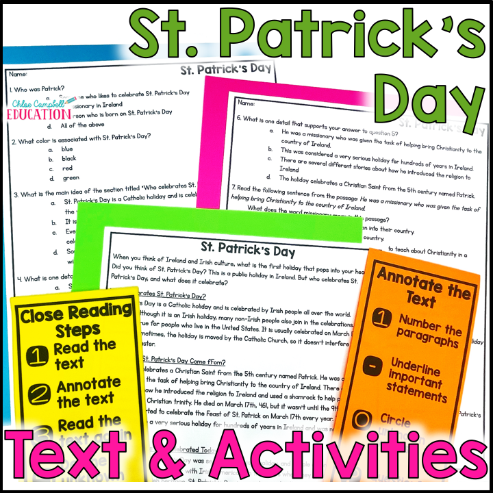 If you’d like to give your students a background on St. Patrick’s Day, try this high-interest, non-fiction passage: St. Patrick’s Close Reading and Comprehension Questions.